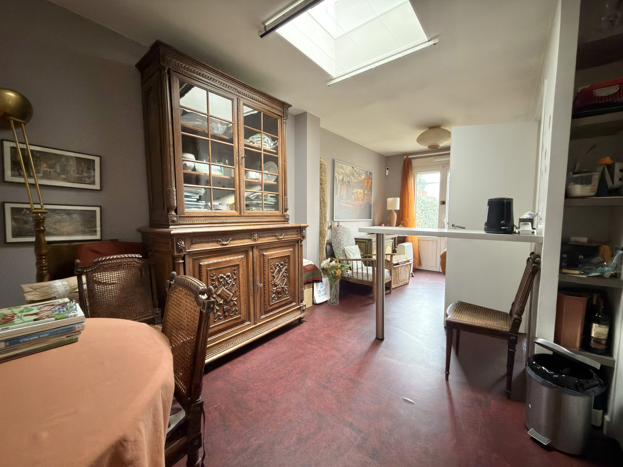 Dès l’entrée, au rez-de-chaussée, un hall avec rangements dessert un appartement indépendant, parfait pour un revenu locatif, une profession libérale ou une future suite parentale. Celui-ci se compose d’un séjour avec cuisine ouverte de 17,82 m², bénéficiant d’une vue sur le jardin, d’une chambre de 7,32 m², d’un bureau de 4,61 m² ainsi que d’une salle d’eau. Ce niveau comprend également un garage avec espace buanderie, apportant un confort appréciable au quotidien.