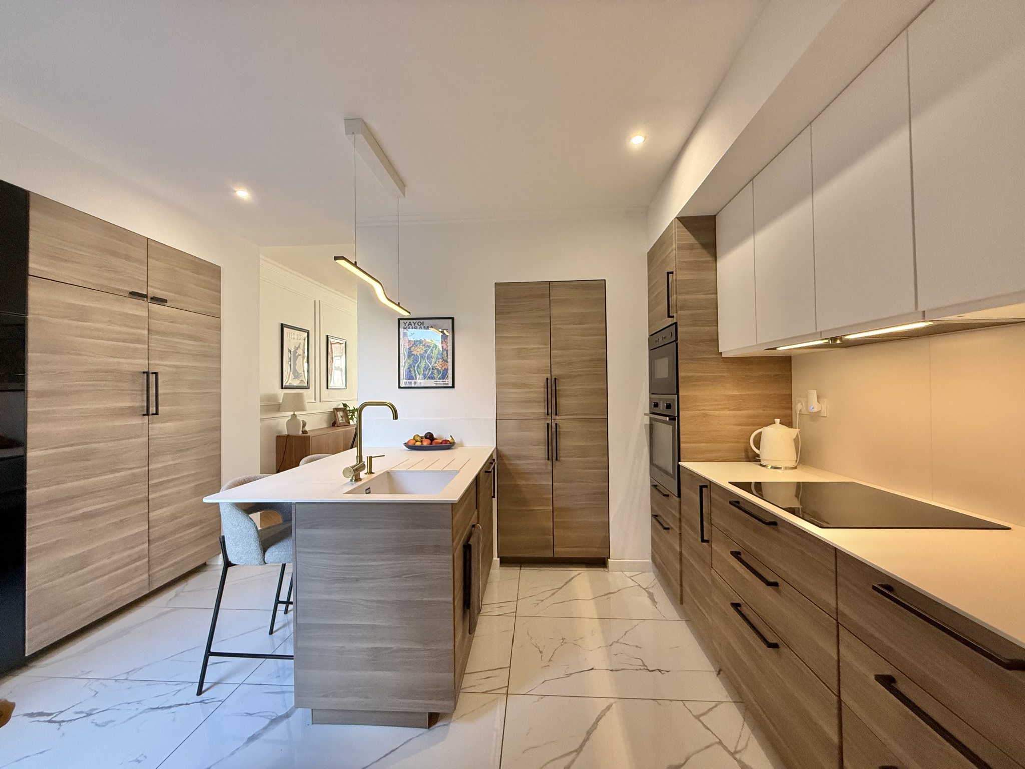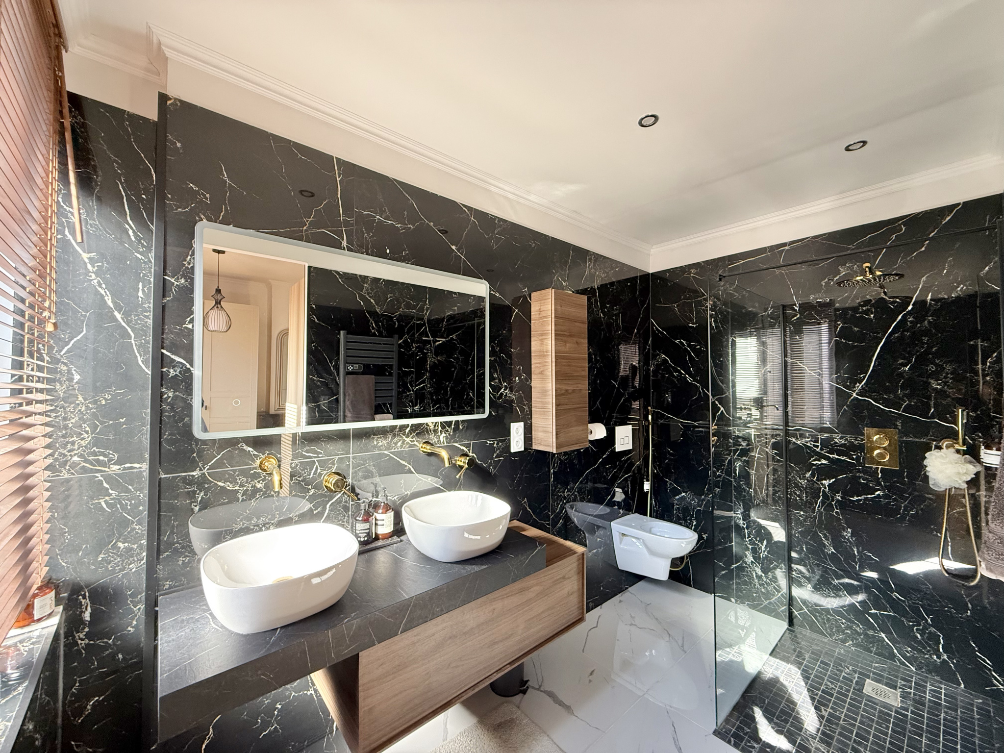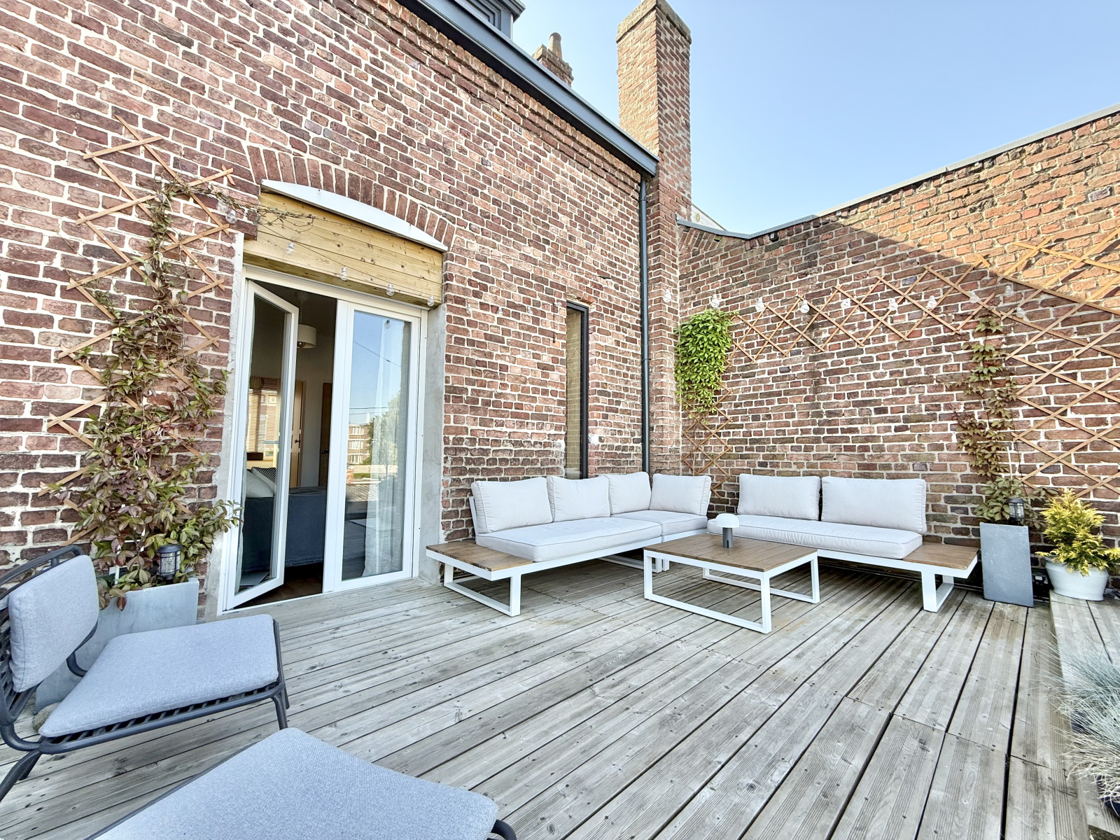 Au rez-de-chaussée, on retrouve une large pièce de vie avec rangements sur-mesure, une cuisine équipée, une buanderie et un jardin avec terrasse en pierre bleue.